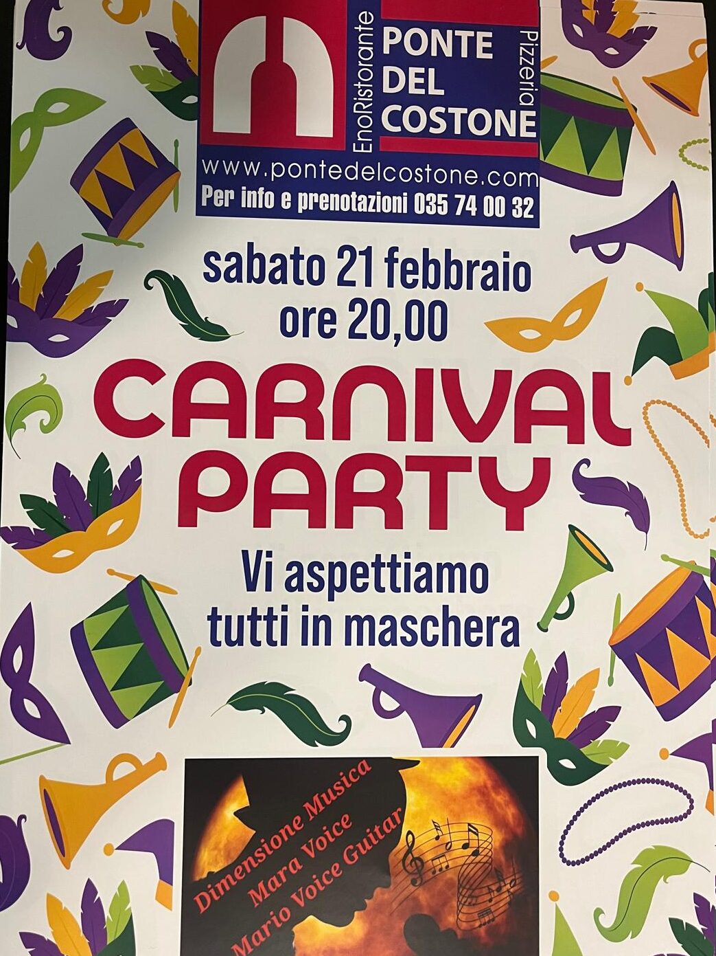 Il Carnevale è arrivato! Siamo pronti a festeggiarlo insieme a voi con una serata speciale all’insegna del divertimento, della buona cucina e della musica dal vivo. Sabato 21 febbraio, a partire dalle ore 20.00, vi aspettiamo tutti in maschera per condividere una cena conviviale e una serata ricca di atmosfera, accompagnata dalla musica di Dimensione Musica con Mara alla voce e Mario alla chitarra.
